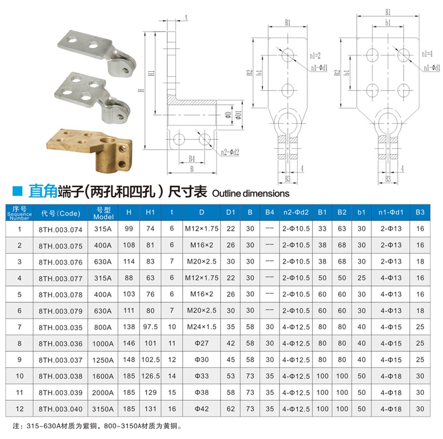 Right-angle terminals (two and four holes)